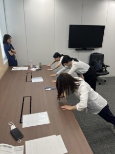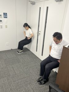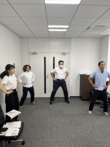 体力測定では、片足バランスを始め5項目を実施し、運動不足の職員には辛い運動もありましたが、各自話も弾み、楽しみながら行うことができました。コミュニケーション不足の解消や運動のきっかけ作りになりました。