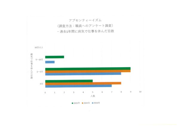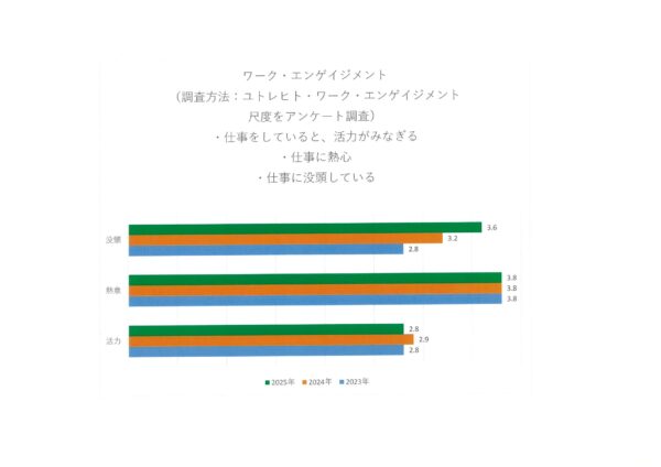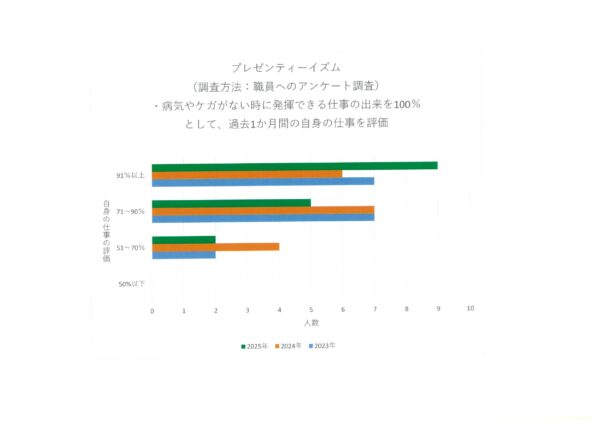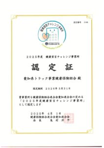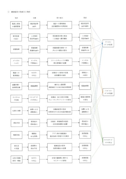 毎年の健康診断や二次検診、50人未満の事業所ですが、ストレスチェックを実施し、アブセンティーイズムやプレゼンティーイズムの低減を防止、また職員への教育機会の提供や長時間労働対策などを実施して、ワーク・エンゲージメントの向上を目指すなど健康経営に取り組んでいます。